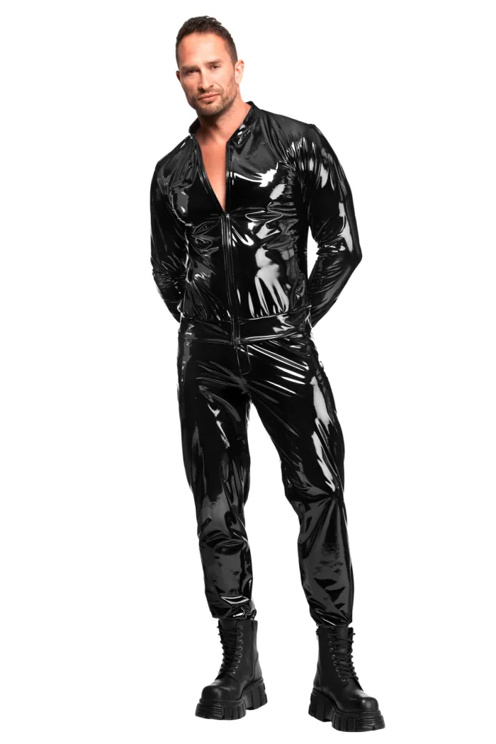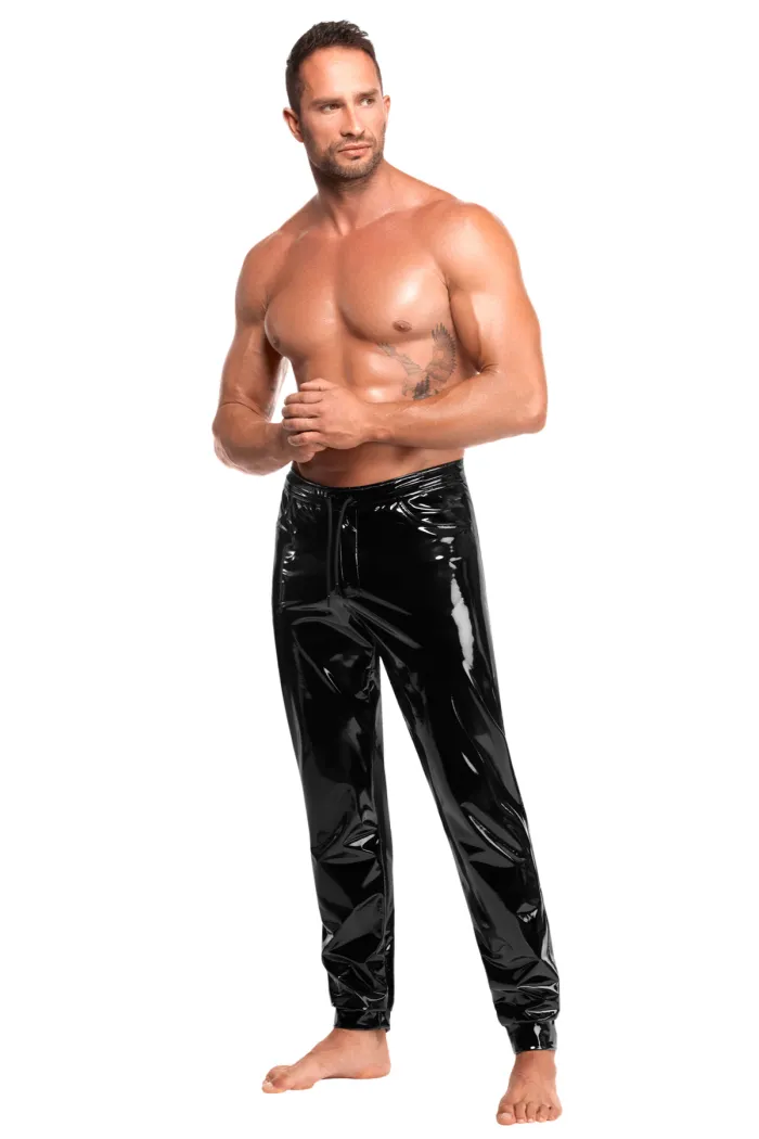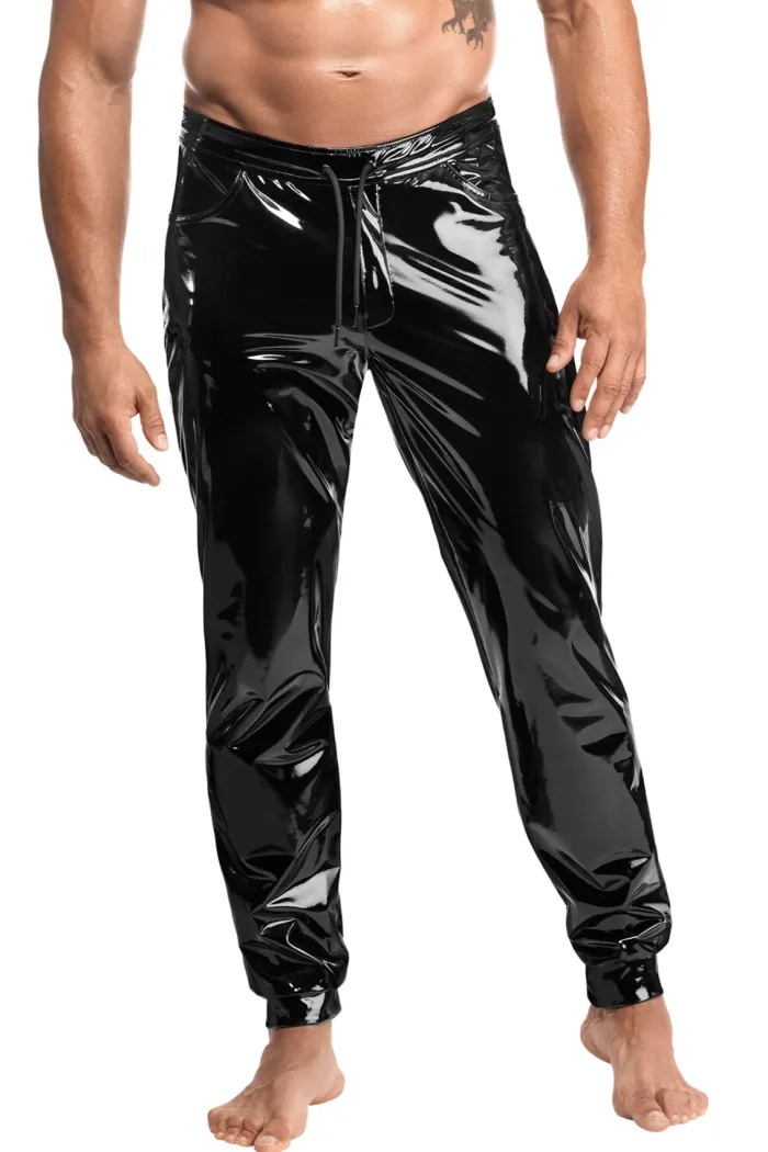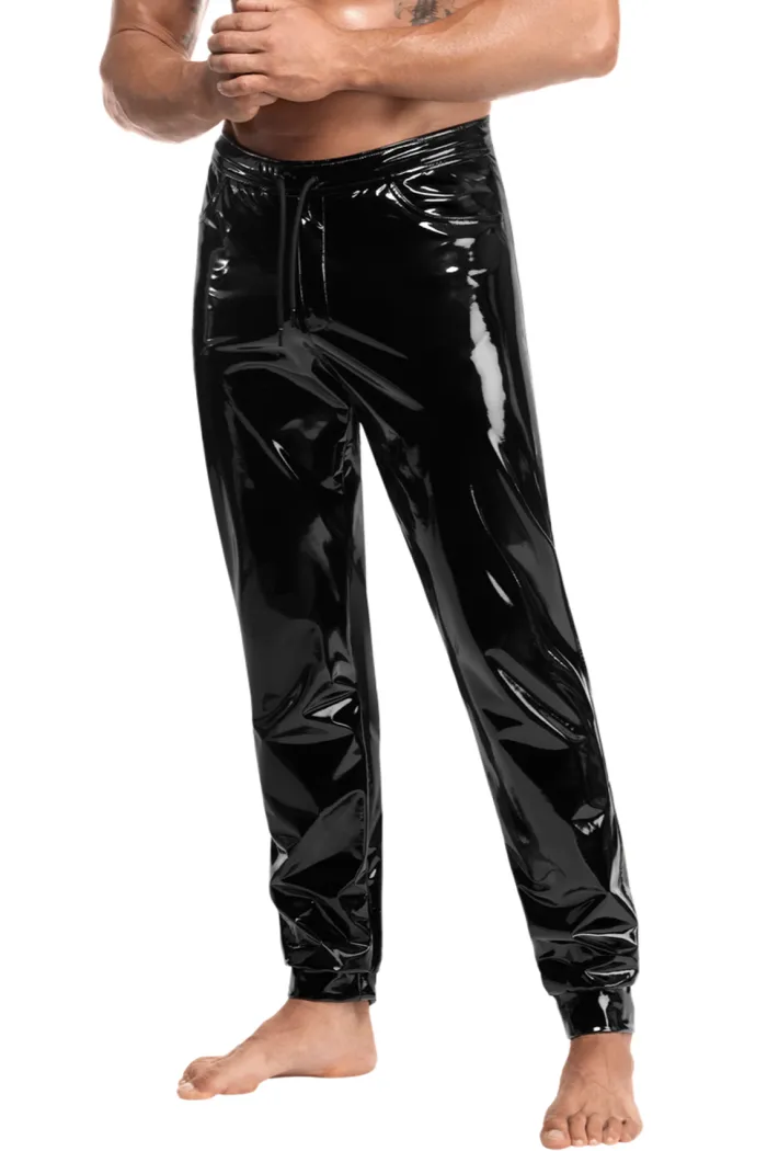 Herren Hose aus glänzendem Lack gefertigt. Verstellbarer Bund, Seitentaschen und glänzende Bündchen an den Knöcheln. Schmale Passform mit glattem Innenfutter für Komfort und Bewegungsfreiheit.