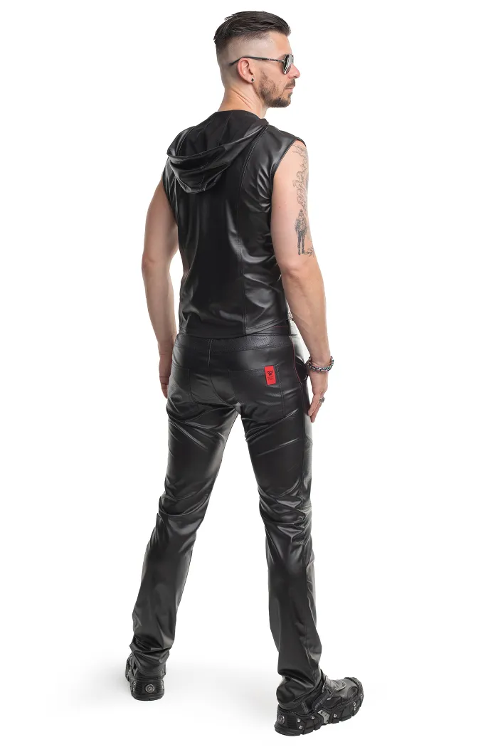 Klassische Low-Waist-Hose aus elastischem schwarzem Wetlook-Stoff. Vorne an den Oberschenkeln befinden sich Einsätze aus perforiertem Material, die die Blicke auf sich ziehen und als attraktives optisches Detail dienen. Die Hose verfügt über zwei Vorder- und zwei Gesäßtaschen, die ausreichend Platz für Handy, Geldbörse, Autoschlüssel oder andere kleine Gegenstände bieten. Die Reißverschlüsse sind mit dem RFP Regnes Fetish Planet-Logo graviert. Die Hose ist mit Gürtelschlaufen ausgestattet, sodass sie mit einem Gürtel getragen werden kann. Ein markantes rotes Alcantara-Etikett mit dem RFP-Logo rundet die Hose perfekt ab - ein Detail, das jeden begeistert, der Wert auf raffinierte und einzigartige Designelemente legt.