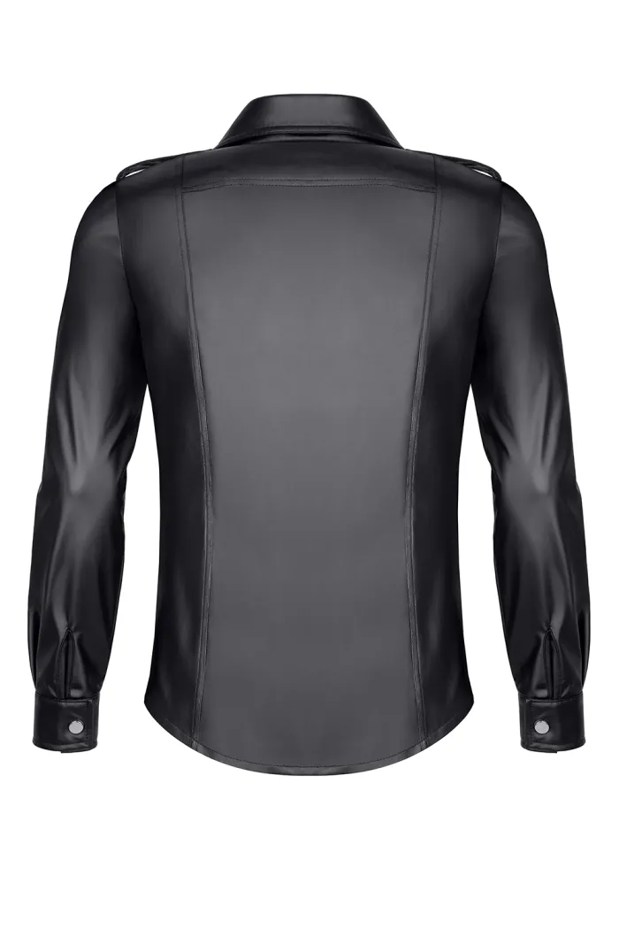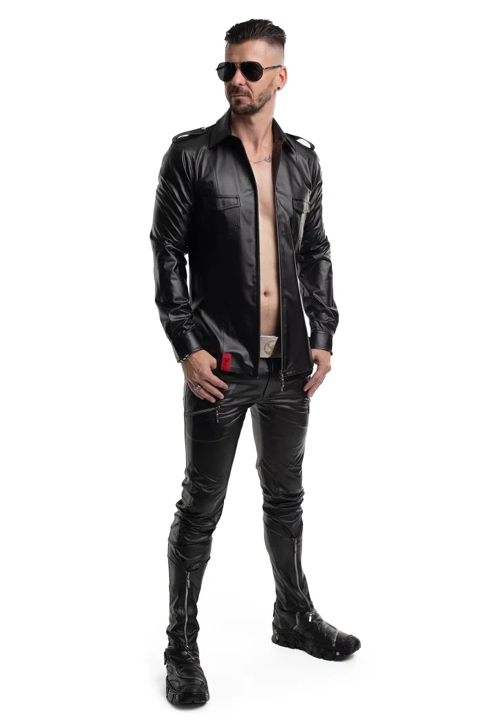 Schwarzes Shirt aus elastischem Wetlook-Material. Auf der Vorderseite fallen zwei praktische Pattentaschen und ein vertikaler Reißverschluss auf, der sich sowohl von oben als auch von unten öffnen lässt. Die Reißverschlüsse sind mit unserem Markenlogo RFP graviert. Der schwarze Kragen verleiht dem Shirt zusätzlich eine sehr elegante Optik. Die Ärmel werden mit dekorativen silbernen Druckknöpfen befestigt, während an den Schultern zwei Schulterklappen mit passenden silbernen Druckknöpfen angebracht sind. Sowohl auf der Vorder- als auch auf der Rückseite befinden sich vier vertikale Nähte, die Teil des Designs sind und für einen optisch schlank machenden Effekt sorgen. Unten befindet sich ein markantes rotes Alcantara-Label mit dem lasergravierten RFP-Logo. Das Shirt sieht perfekt aus in Kombination mit der Hose RMGabriele001 – wie auf den Fotos zu sehen.