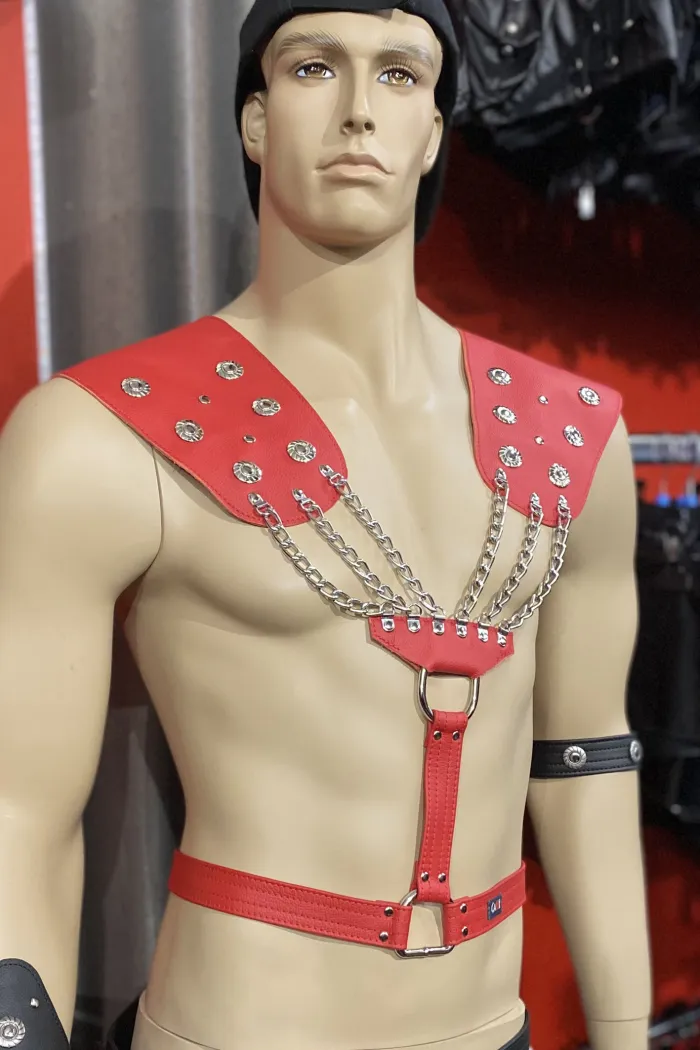 Nappaleder-Harness auf den Trägern verziert mit Rosetten und Nieten. Vorne und hinten massive Ketten. Es lässt sich seitlich durch Schnallen auf die gewünschte Größe einstellen. Achtung: Da alle Lederartikel (Made in Germany) in Handarbeit gefertigt werden kann es unter Umständen zu leichten Abweichungen vom Bild kommen.