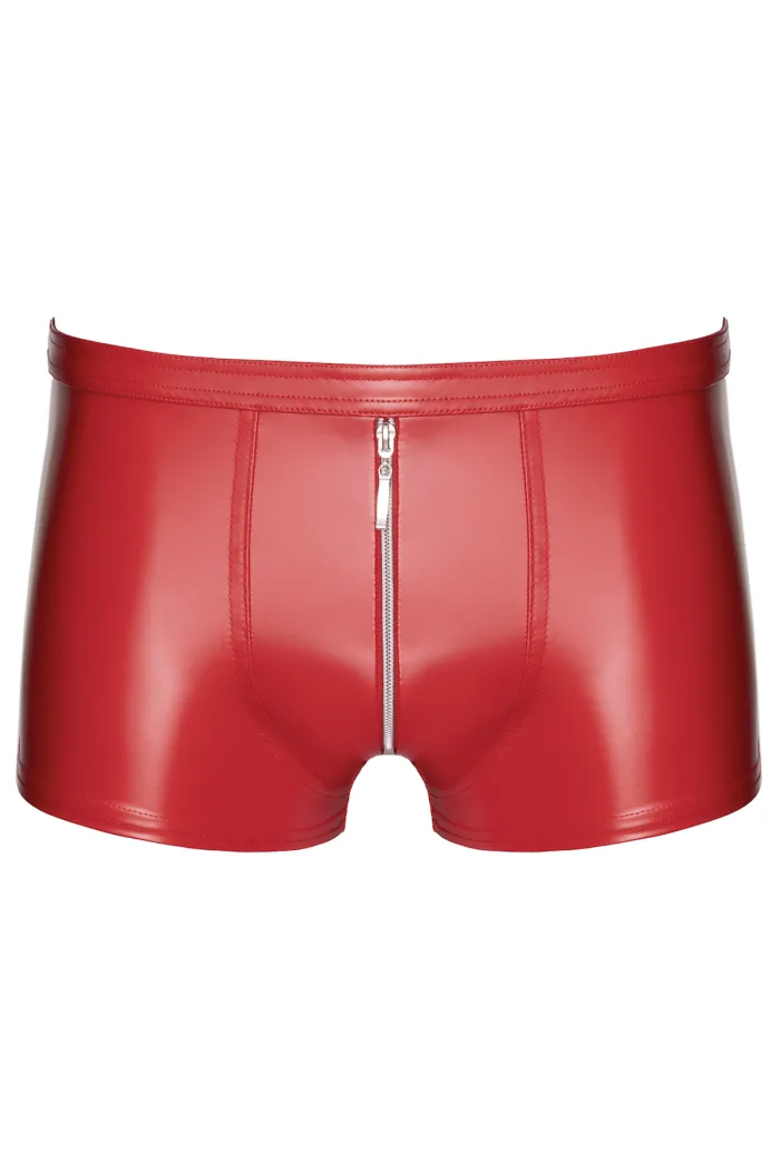 Herren Shorts aus rotem Powerwetlook gefertigt. Kurzer, figurbetonter Schnitt mit langem, silbernem Schrittreißverschluss und elastischem Bund. Weiches Innenfutter, glatte Oberfläche und flexible Passform.