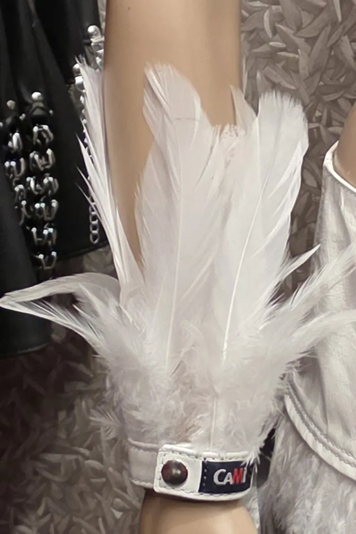 Nappaleder-Armstulpen, verziert mit weißen Federn. Sie lassen sich durch Druckknöpfe auf den gewünschten Umfang einstellen. Achtung: Da alle Lederartikel (Made in Germany) in Handarbeit gefertigt werden kann es unter Umständen zu leichten Abweichungen vom Bild kommen.
