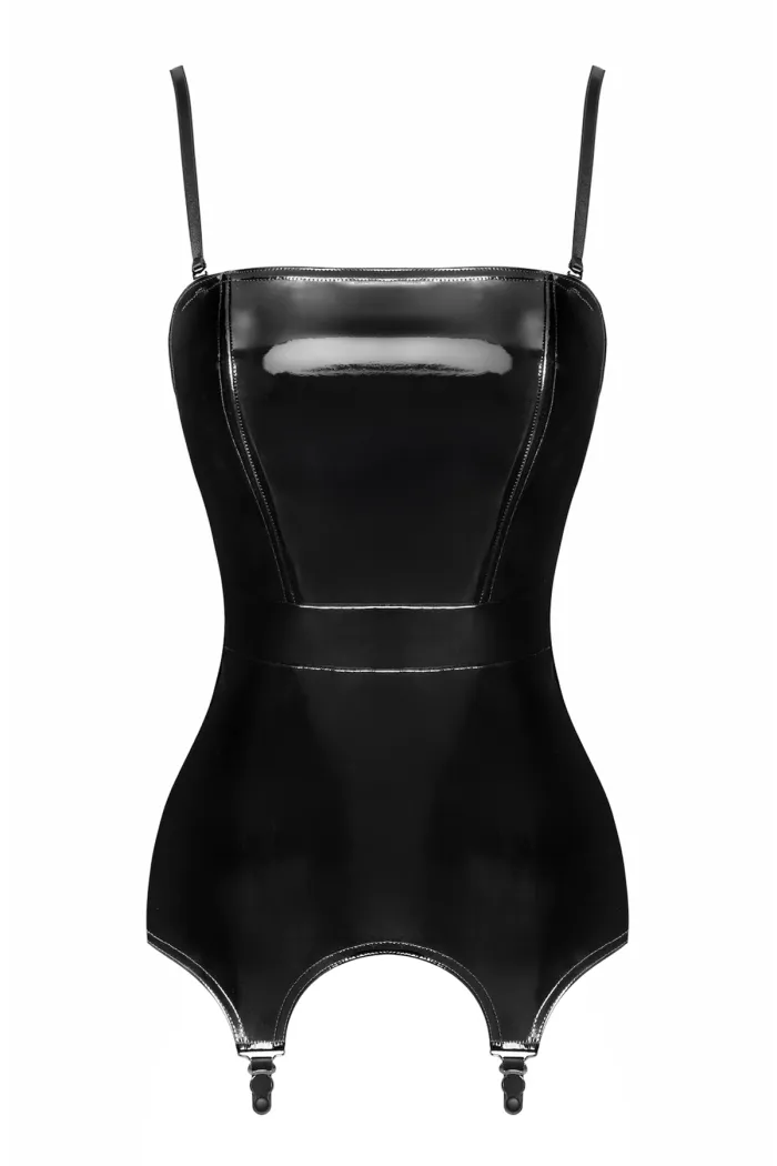 Eine verführerische Fusion zweier Klassiker – Korsett und Strumpfhalter in einem. Gefertigt aus schwarzen Lack-Stoff, betont es die Taille und betont die weiblichen Kurven. Das Oberteil im Korsett-Stil ist mit Stäbchen verstärkt für eine figurbetonte Passform und zusätzlichen Halt. Ein Reißverschluss auf der Rückseite erleichtert das An- und Ausziehen. Der untere Teil fungiert als Strumpfhalter mit vier Strapsen. Perfekt für Frauen, die Stil mit Eleganz kombinieren möchten.