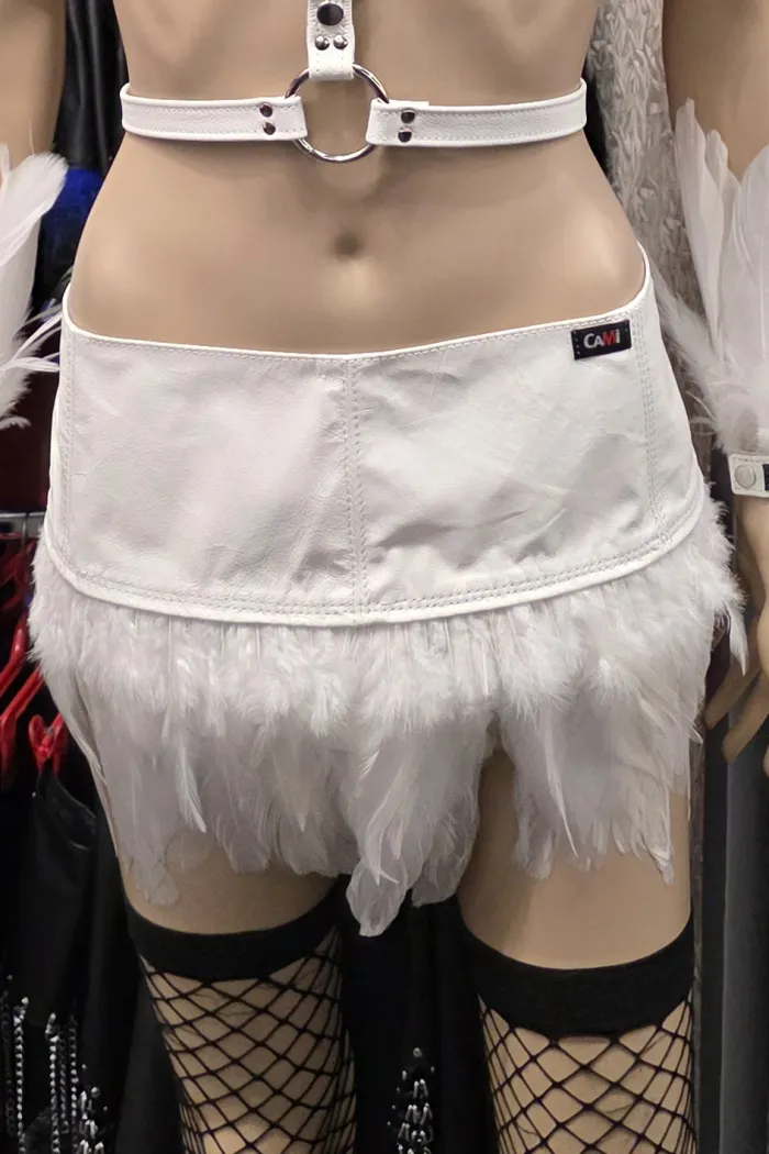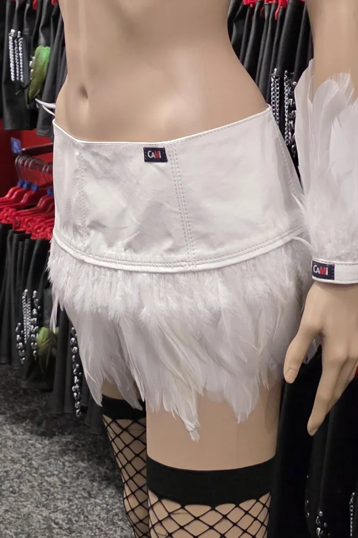 Nappaleder Damenrock verziert mit weißen Hahnenfedern. Er wird auf der Hüfte getragen und lässt sich durch einen Reißverschluss hinten komplett öffnen & schließen. Achtung: Da alle Lederartikel (Made in Germany) in Handarbeit gefertigt werden kann es unter Umständen zu leichten Abweichungen vom Bild kommen.