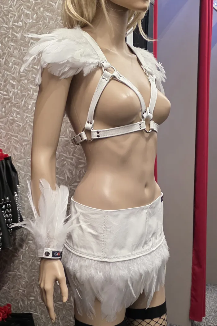 Nappaleder-Harness, verziert mit weißen Federn, Ringen & Nieten, Es lässt sich hinten durch Schnallen verstellen. Achtung: Da alle Lederartikel (Made in Germany) in Handarbeit gefertigt werden kann es unter Umständen zu leichten Abweichungen vom Bild kommen.
